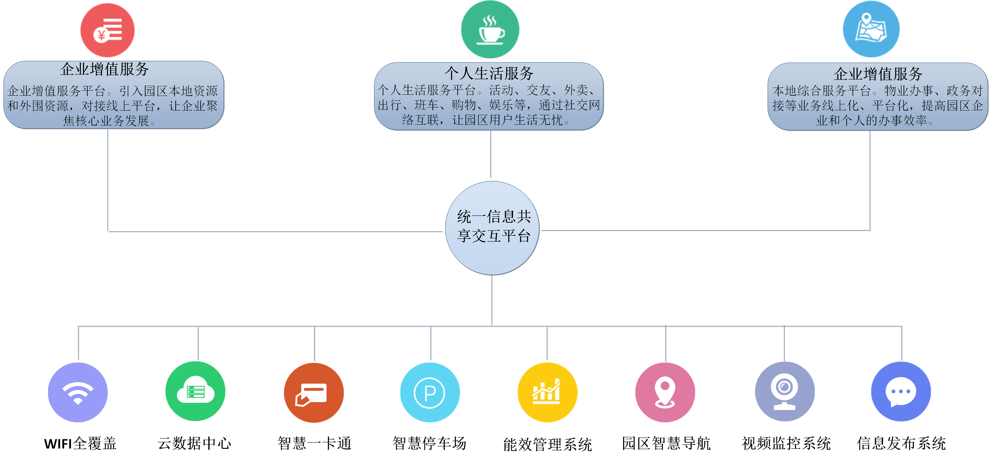 通过对园区当前发展现状和对未来发展趋势的分析,结合先进的通信信息化、智能化技术,打造了以综合管理平台为基础,智能对接安防管理、物联应用以及软服务系统的智慧园区整体解决方案。实现园区物理资源和信息资源的高度系统化整合和深度开发,以助力园区运维、激励企业创新、促进产业结构升级,带动园区和地方发展。